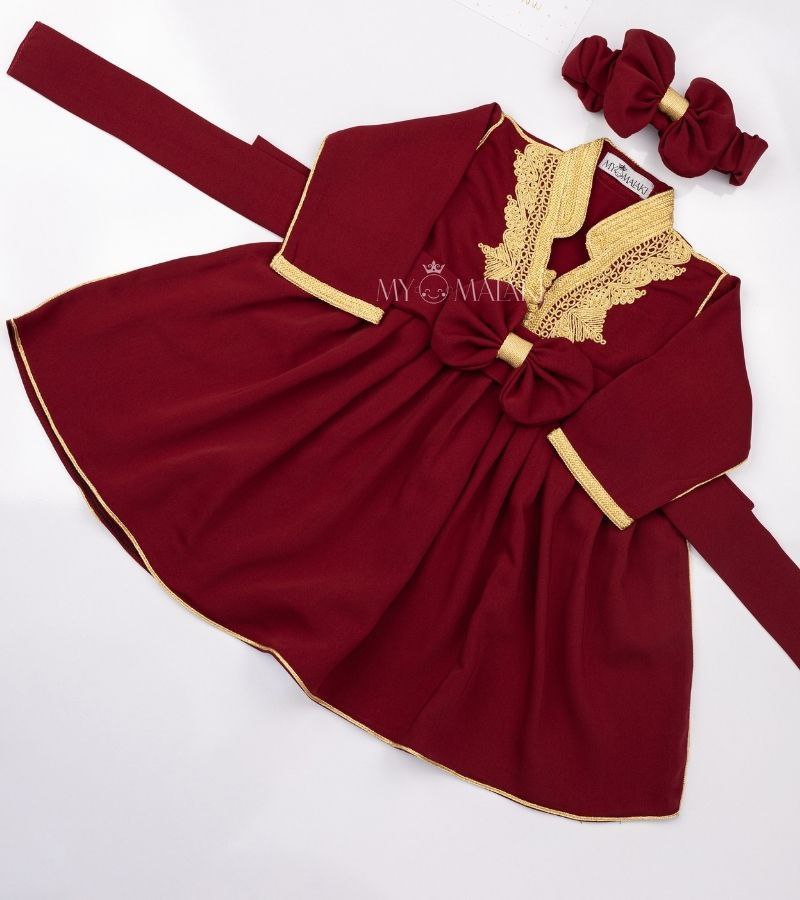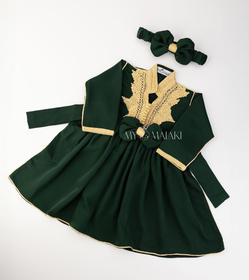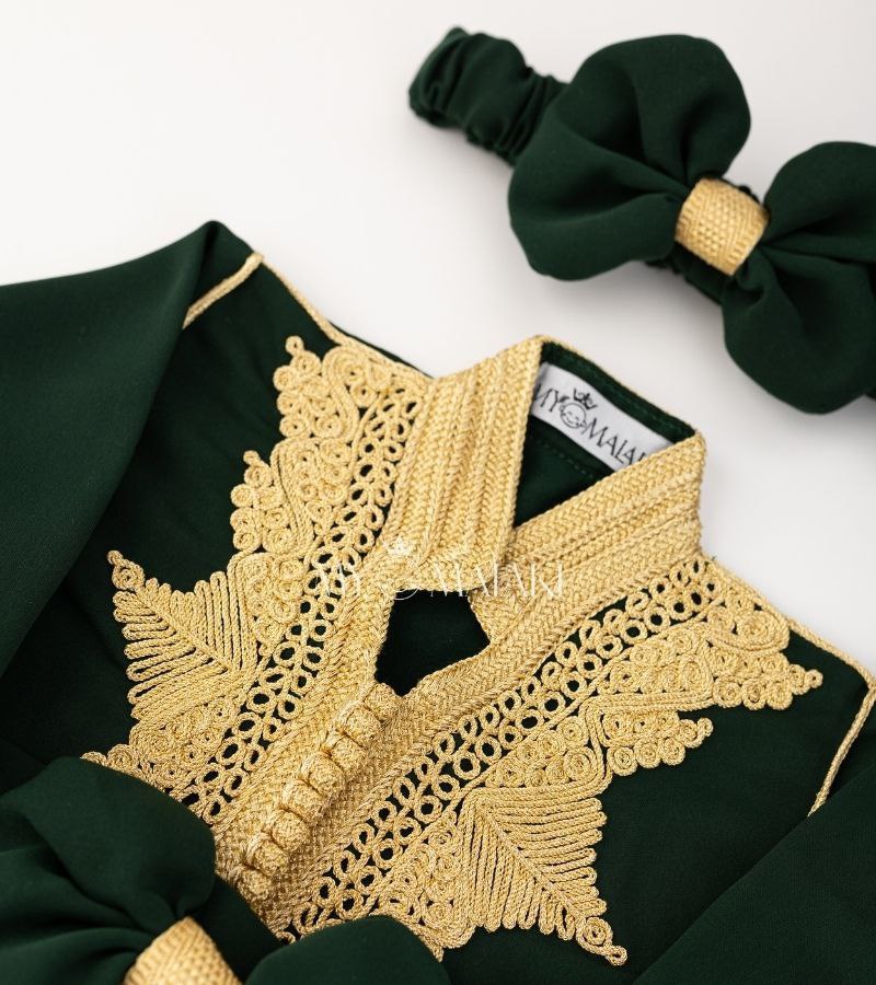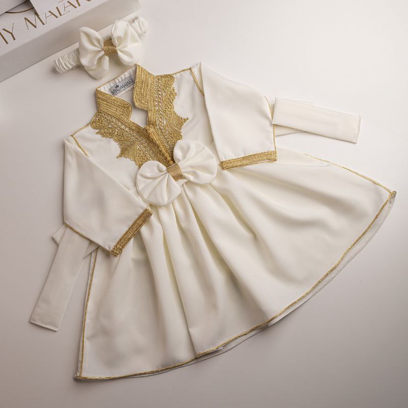 in white—an exquisite caftan designed to give your little girl a magnificent, regal look that will captivate with unmatched beauty and elegance. This luxurious piece masterfully blends Moroccan heritage with royal sophistication. The caftan comes in a striking white , highlighted with intricate golden embroidery that adorns the collar and sleeves, ensuring she stands out at every event.